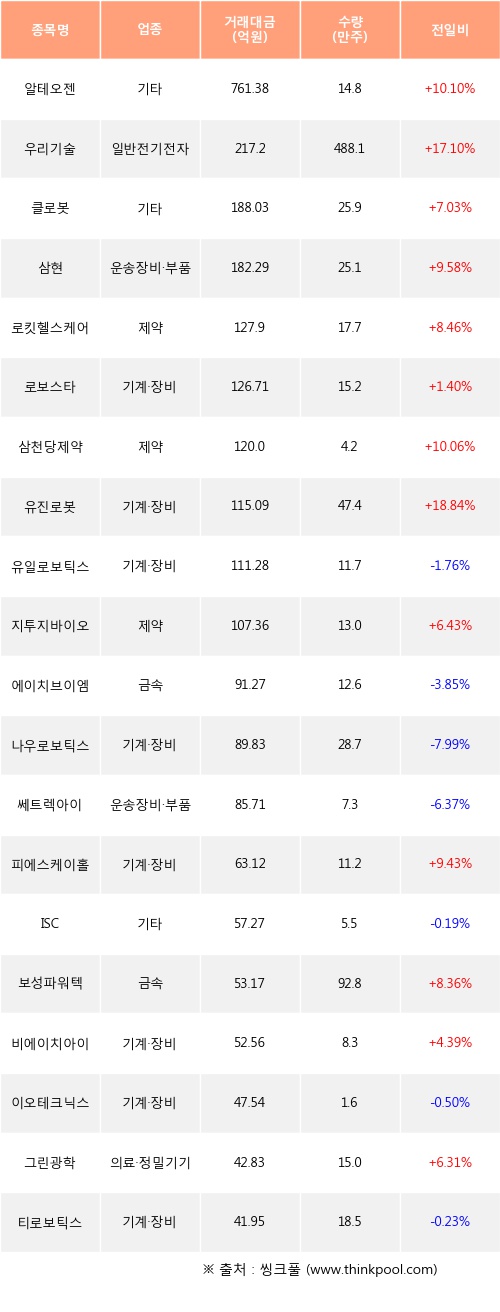 알테오젠, 우리기술, 클로봇 등은 전일 대비 주가가 상승했고, 유일로보틱스, 에이치브이엠, 나우로보틱스 등은 주가가 하락했다.