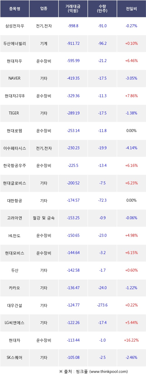 외국인 투자자의 순매도 상위 20개 종목은 삼성전자우, 두산에너빌리티, 현대차우, NAVER, 현대차2우B, TIGER 미국나스닥100, 현대로템, 이수페타시스, 한국항공우주, 현대글로비스등이다.