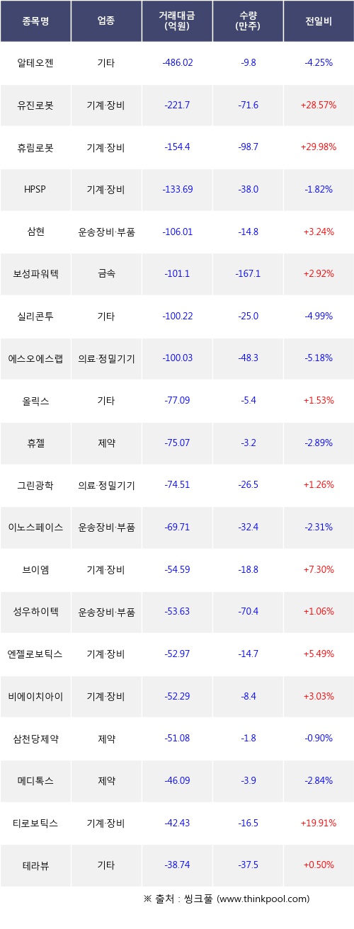 외국인 투자자의 순매도 상위 20개 종목은 알테오젠, 유진로봇, 휴림로봇, HPSP, 삼현, 보성파워텍, 실리콘투, 에스오에스랩, 올릭스, 휴젤등이다.