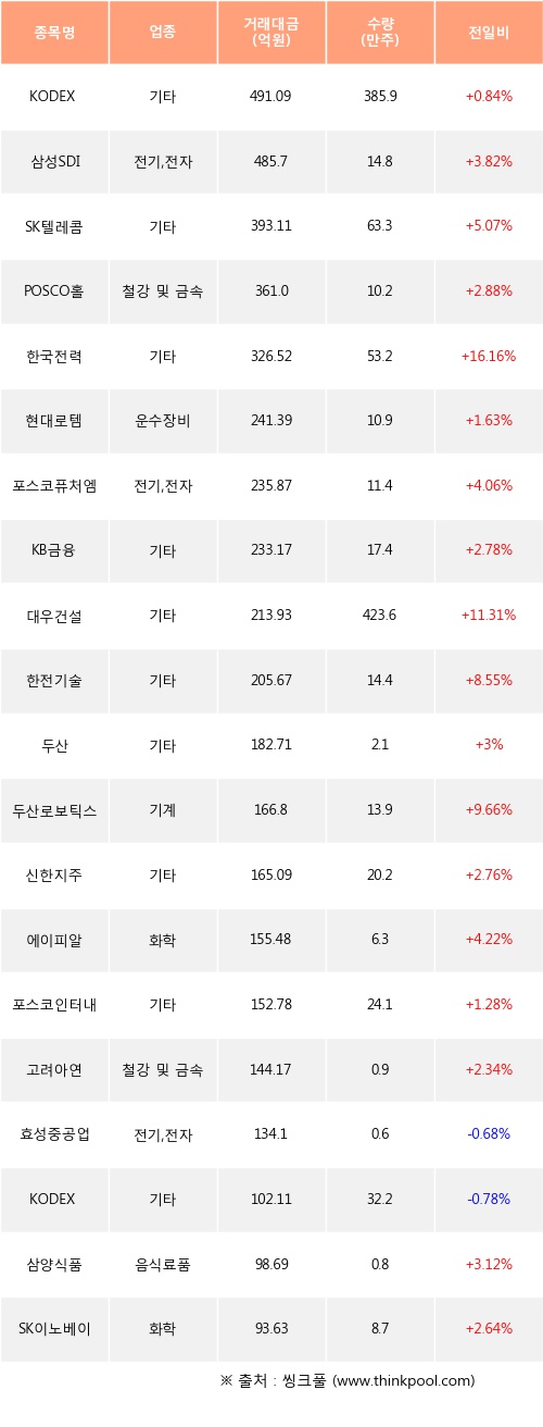 기관 투자자의 순매수 상위 20개 종목은 KODEX 코스닥150레버리지, 삼성SDI, SK텔레콤, POSCO홀딩스, 한국전력, 현대로템, 포스코퓨처엠, KB금융, 대우건설, 한전기술등이다.