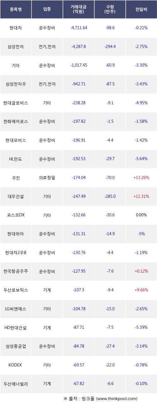 외국인 투자자의 순매도 상위 20개 종목은 현대차, 삼성전자, 기아, 삼성전자우, 현대글로비스, 한화에어로스페이스, 현대모비스, HL만도, 우진, 대우건설등이다.