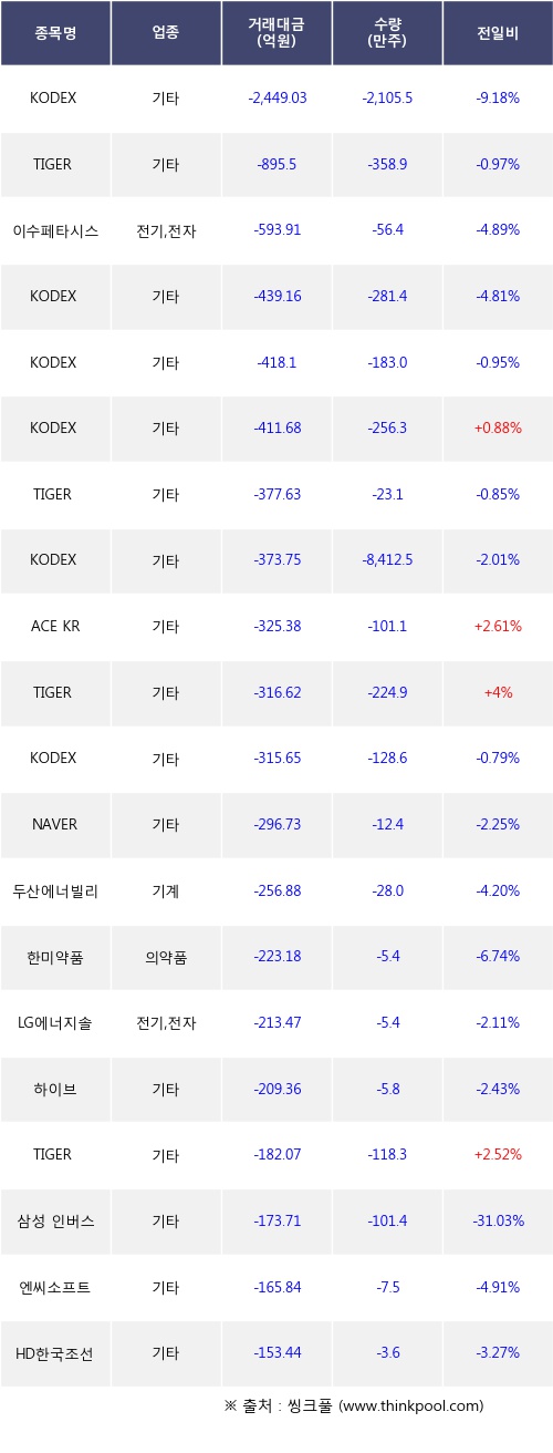기관 투자자의 순매도 상위 20개 종목은 KODEX 코스닥150레버리지, TIGER 미국S&P500, 이수페타시스, KODEX 코스닥150, KODEX 미국S&P500, KODEX 은선물(H), TIGER 미국나스닥100, KODEX 200선물인버스2X, ACE KRX금현물, TIGER 코리아휴머노이드로봇산업등이다.