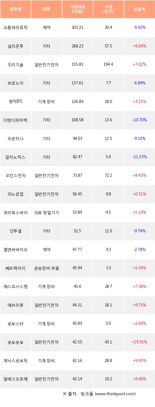 실리콘투, 우리기술, 원익IPS 등은 전일 대비 주가가 상승했고, 오름테라퓨틱, 보로노이, 디앤디파마텍 등은 주가가 하락했다.