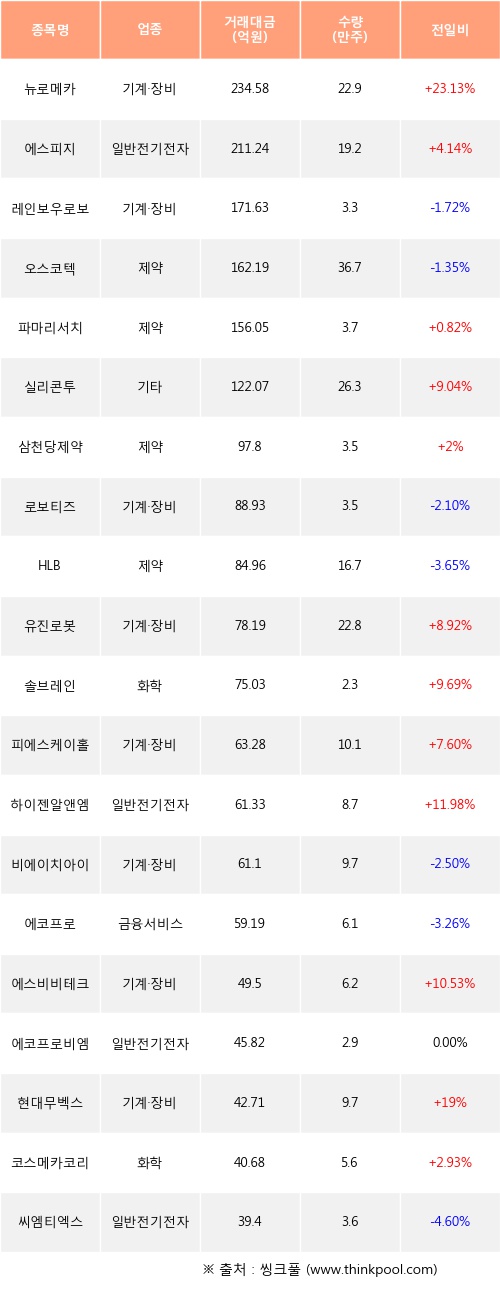 기관 투자자의 순매수 상위 20개 종목은 뉴로메카, 에스피지, 레인보우로보틱스, 오스코텍, 파마리서치, 실리콘투, 삼천당제약, 로보티즈, HLB, 유진로봇등이다.