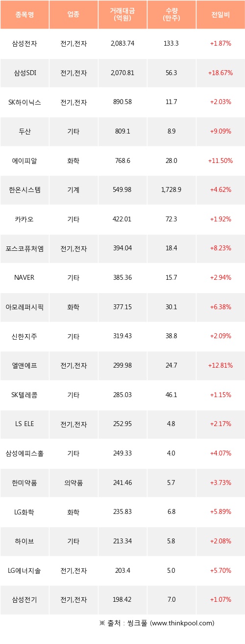 외국인 투자자의 순매수 상위 20개 종목은 삼성전자, 삼성SDI, SK하이닉스, 두산, 에이피알, 한온시스템, 카카오, 포스코퓨처엠, NAVER, 아모레퍼시픽등이다.