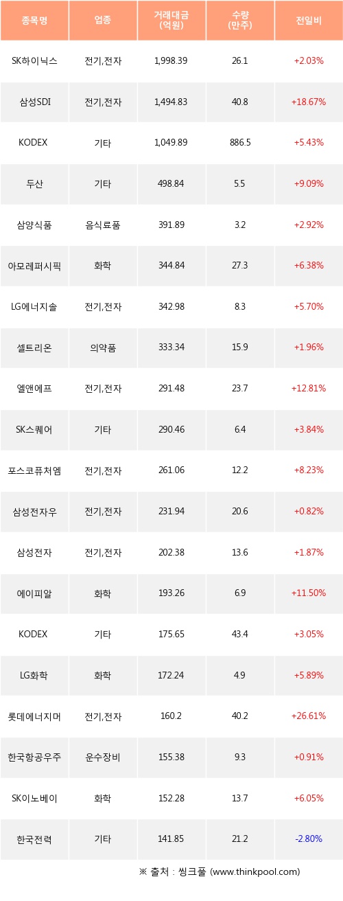 기관 투자자의 순매수 상위 20개 종목은 SK하이닉스, 삼성SDI, KODEX 코스닥150레버리지, 두산, 삼양식품, 아모레퍼시픽, LG에너지솔루션, 셀트리온, 엘앤에프, SK스퀘어등이다.