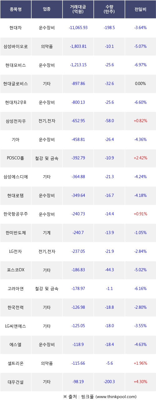 외국인 투자자의 순매도 상위 20개 종목은 현대차, 삼성바이오로직스, 현대모비스, 현대글로비스, 현대차2우B, 삼성전자우, 기아, POSCO홀딩스, 삼성에스디에스, 현대로템등이다.