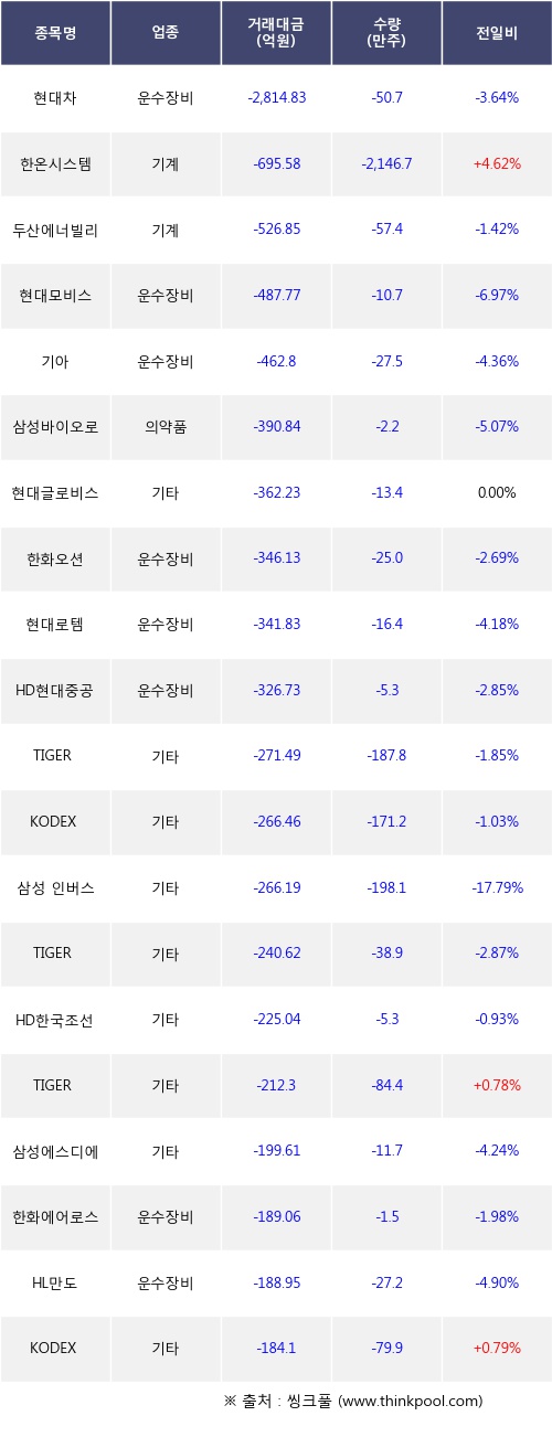 기관 투자자의 순매도 상위 20개 종목은 현대차, 한온시스템, 두산에너빌리티, 현대모비스, 기아, 삼성바이오로직스, 현대글로비스, 한화오션, 현대로템, HD현대중공업등이다.