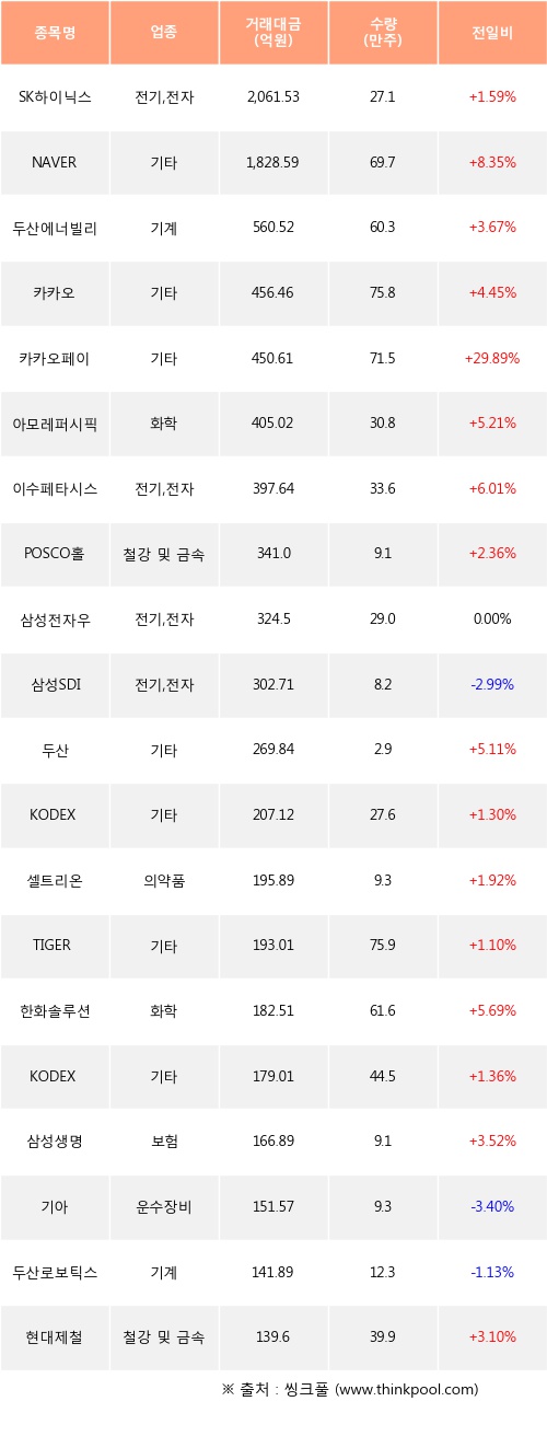 기관 투자자의 순매수 상위 20개 종목은 SK하이닉스, NAVER, 두산에너빌리티, 카카오, 카카오페이, 아모레퍼시픽, 이수페타시스, POSCO홀딩스, 삼성전자우, 삼성SDI등이다.