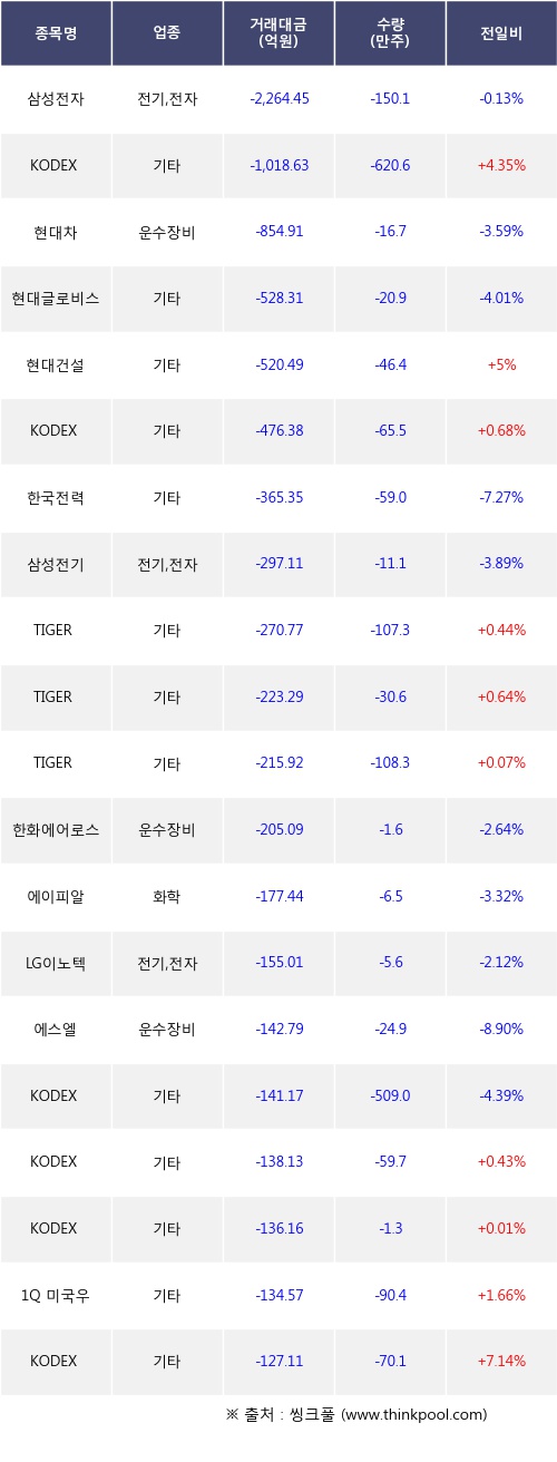 기관 투자자의 순매도 상위 20개 종목은 삼성전자, KODEX 코스닥150, 현대차, 현대글로비스, 현대건설, KODEX 200, 한국전력, 삼성전기, TIGER 미국S&P500, TIGER 200등이다.