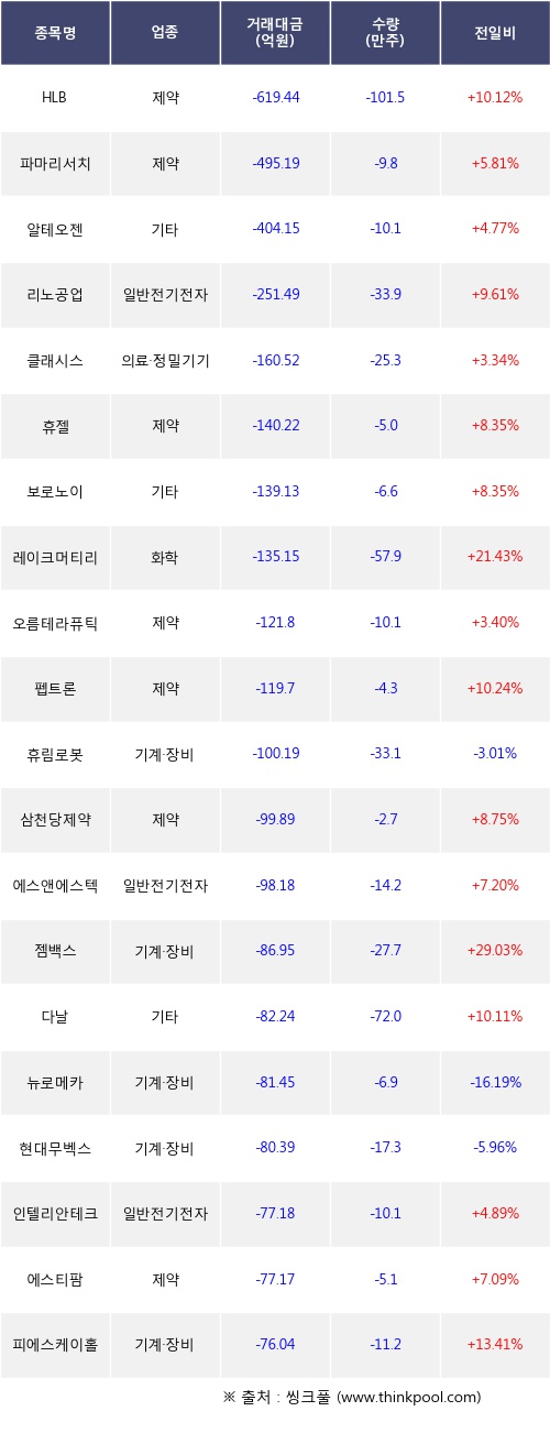 외국인 투자자의 순매도 상위 20개 종목은 HLB, 파마리서치, 알테오젠, 리노공업, 클래시스, 휴젤, 보로노이, 레이크머티리얼즈, 오름테라퓨틱, 펩트론등이다.