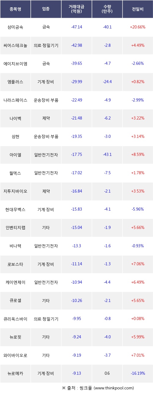 기관 투자자의 순매도 상위 20개 종목은 삼미금속, 씨어스테크놀로지, 에이치브이엠, 엠플러스, 나라스페이스테크놀로지, 나이벡, 삼현, 아이엘, 월덱스, 지투지바이오등이다.
