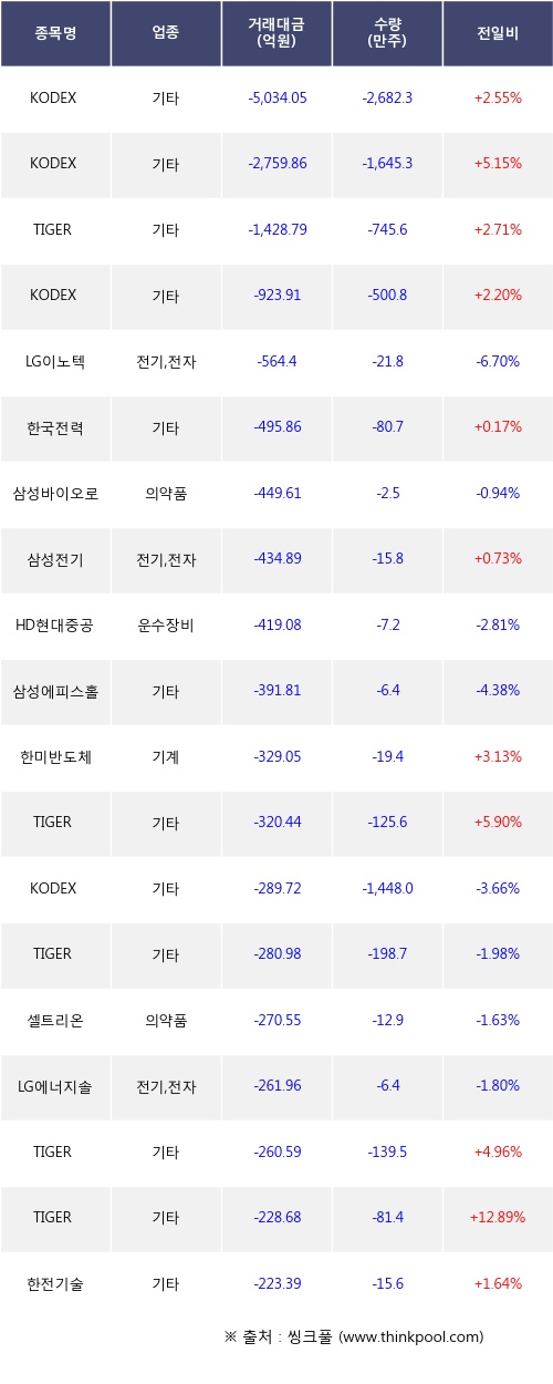 기관 투자자의 순매도 상위 20개 종목은 KODEX 코스닥150, KODEX 코스닥150레버리지, TIGER 코스닥150, KODEX 은선물(H), LG이노텍, 한국전력, 삼성바이오로직스, 삼성전기, HD현대중공업, 삼성에피스홀딩스등이다.