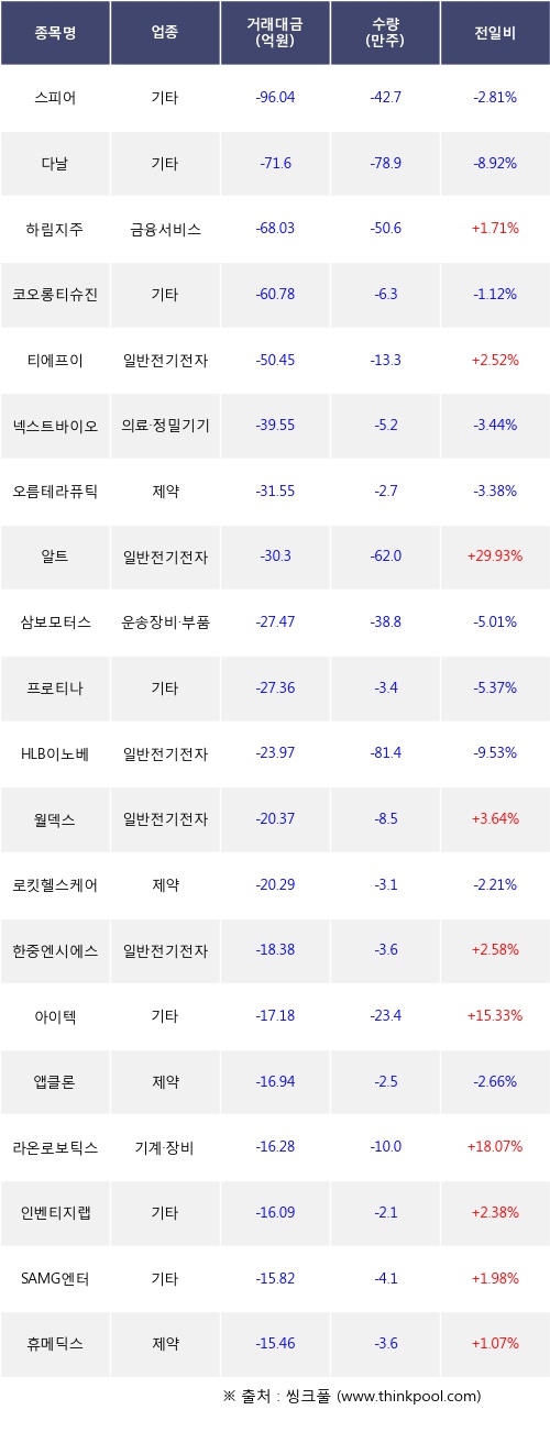 기관 투자자의 순매도 상위 20개 종목은 스피어, 다날, 하림지주, 코오롱티슈진, 티에프이, 넥스트바이오메디컬, 오름테라퓨틱, 알트, 삼보모터스, 프로티나등이다.