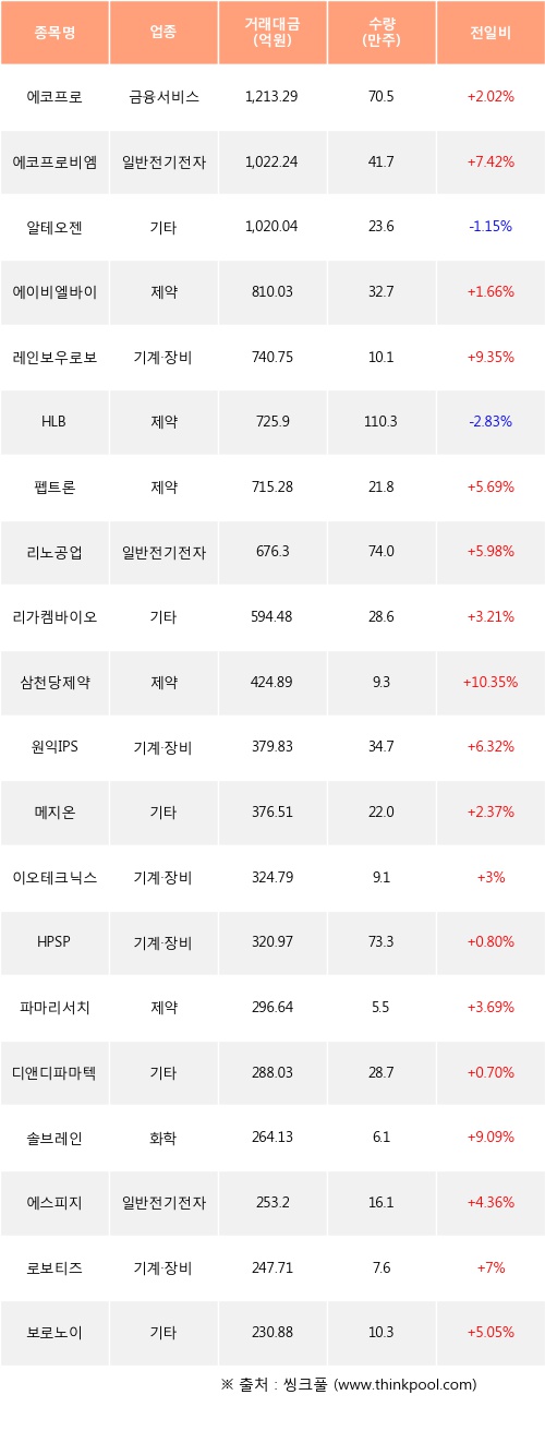 에코프로, 에코프로비엠, 에이비엘바이오 등은 전일 대비 주가가 상승했고, 알테오젠, HLB 등은 주가가 하락했다.
