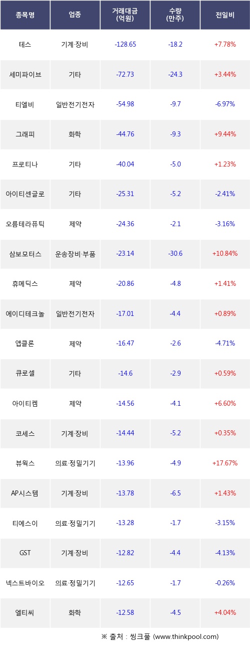 기관 투자자의 순매도 상위 20개 종목은 테스, 세미파이브, 티엘비, 그래피, 프로티나, 아이티센글로벌, 오름테라퓨틱, 삼보모터스, 휴메딕스, 에이디테크놀로지등이다.
