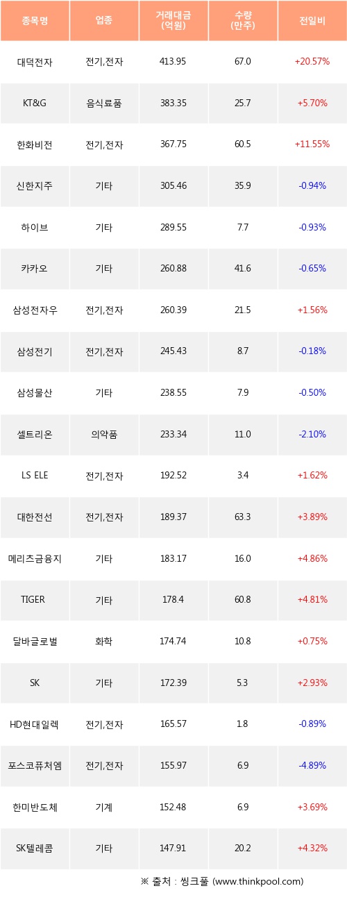 외국인 투자자의 순매수 상위 20개 종목은 대덕전자, KT&G, 한화비전, 신한지주, 하이브, 카카오, 삼성전자우, 삼성전기, 삼성물산, 셀트리온등이다.