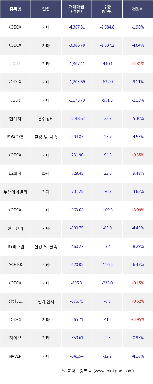 기관 투자자의 순매도 상위 20개 종목은 KODEX 코스닥150, KODEX 코스닥150레버리지, TIGER 반도체TOP10, KODEX 은선물(H), TIGER 코스닥150, 현대차, POSCO홀딩스, KODEX 200, LG화학, 두산에너빌리티등이다.