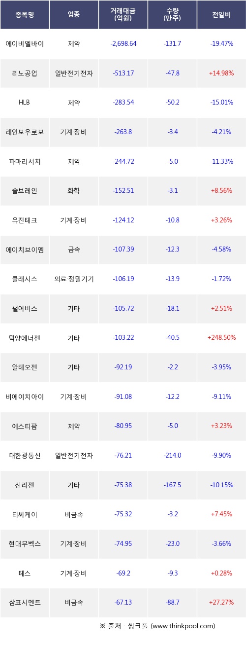 외국인 투자자의 순매도 상위 20개 종목은 에이비엘바이오, 리노공업, HLB, 레인보우로보틱스, 파마리서치, 솔브레인, 유진테크, 에이치브이엠, 클래시스, 펄어비스등이다.
