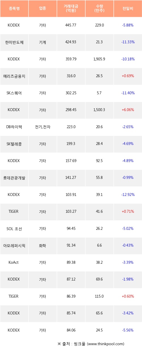 메리츠금융지주, KODEX 인버스, TIGER 미국S&P500 등은 전일 대비 주가가 상승했고, KODEX 코스닥150, 한미반도체, KODEX 2차전지산업레버리지 등은 주가가 하락했다.