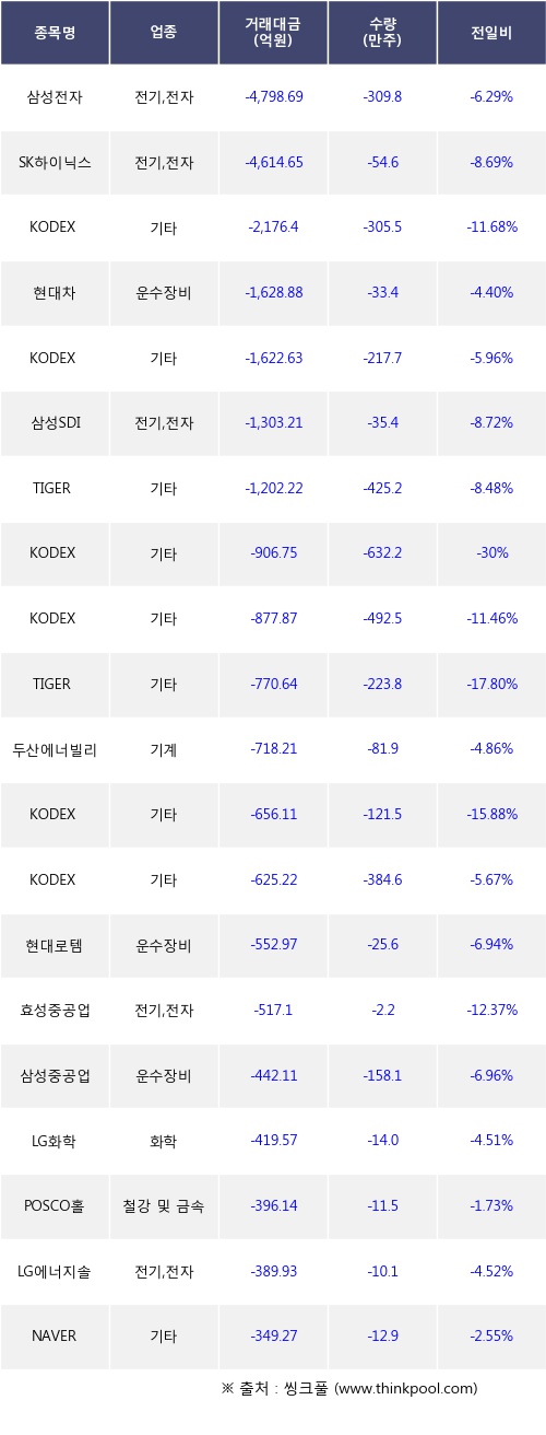 이날 기관 투자자가 순매도한 종목들 중에 삼성전자, SK하이닉스, KODEX 레버리지 등은 전일 대비 주가가 하락했다.