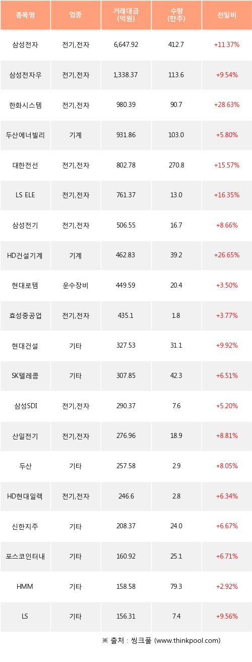 외국인 투자자의 순매수 상위 20개 종목은 삼성전자, 삼성전자우, 한화시스템, 두산에너빌리티, 대한전선, LS ELECTRIC, 삼성전기, HD건설기계, 현대로템, 효성중공업등이다.