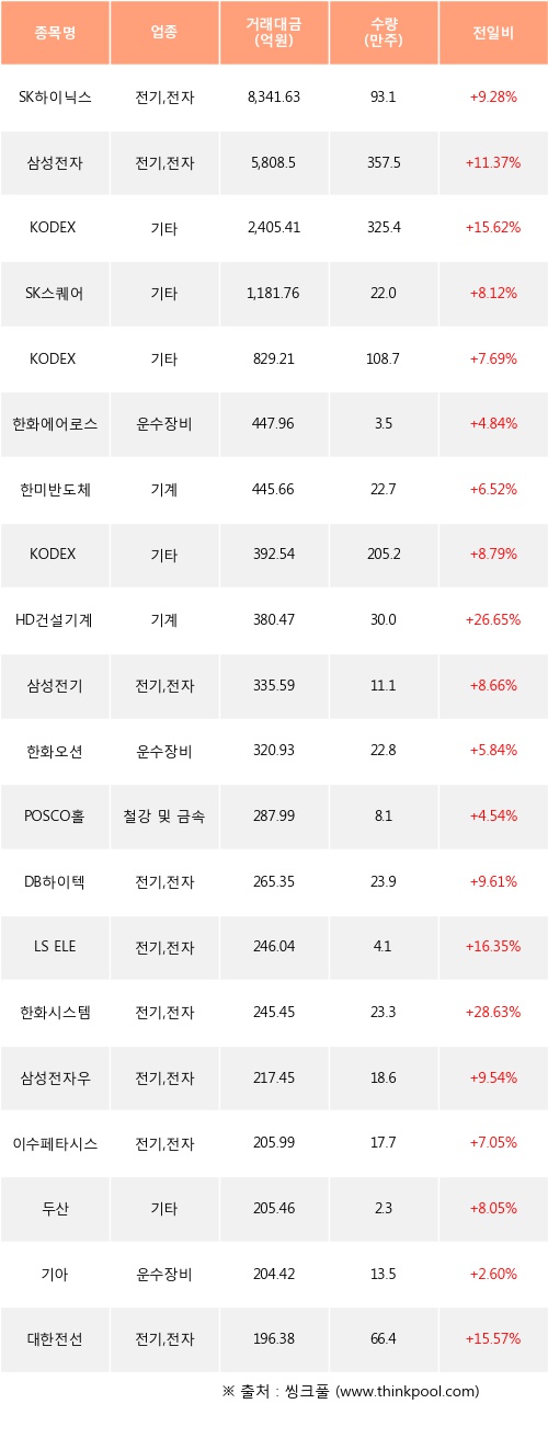 이날 기관 투자자가 순매수한 종목들 중에 SK하이닉스, 삼성전자, KODEX 레버리지 등은 전일 대비 주가가 상승했다.