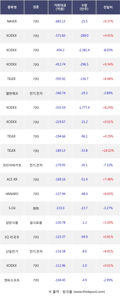 기관 투자자의 순매도 상위 20개 종목은 NAVER, KODEX 코스닥150, KODEX 인버스, KODEX 은선물(H), TIGER 반도체TOP10, 엘앤에프, KODEX 2차전지산업레버리지, KODEX 머니마켓액티브, TIGER 코스닥150, TIGER 반도체TOP10레버리지등이다.