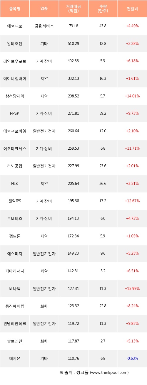 에코프로, 알테오젠, 레인보우로보틱스 등은 전일 대비 주가가 상승했고, 메지온 등은 주가가 하락했다.