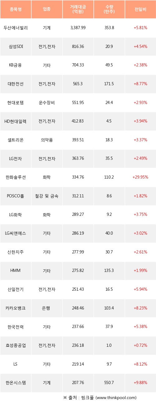 외국인 투자자의 순매수 상위 20개 종목은 두산에너빌리티, 삼성SDI, KB금융, 대한전선, 현대로템, HD현대일렉트릭, 셀트리온, LG전자, 한화솔루션, POSCO홀딩스등이다.