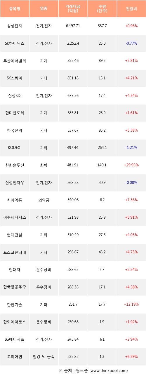 기관 투자자의 순매수 상위 20개 종목은 삼성전자, SK하이닉스, 두산에너빌리티, SK스퀘어, 삼성SDI, 한미반도체, 한국전력, KODEX 코스닥150레버리지, 한화솔루션, 삼성전자우등이다.