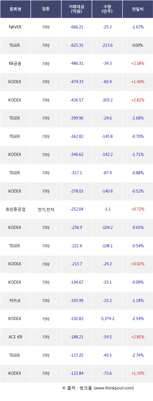 기관 투자자의 순매도 상위 20개 종목은 NAVER, TIGER 반도체TOP10, KB금융, KODEX 200, KODEX 은선물(H), TIGER 미국나스닥100, TIGER 미국S&P500, KODEX 미국나스닥100, TIGER 반도체TOP10레버리지, KODEX 코스닥150등이다.