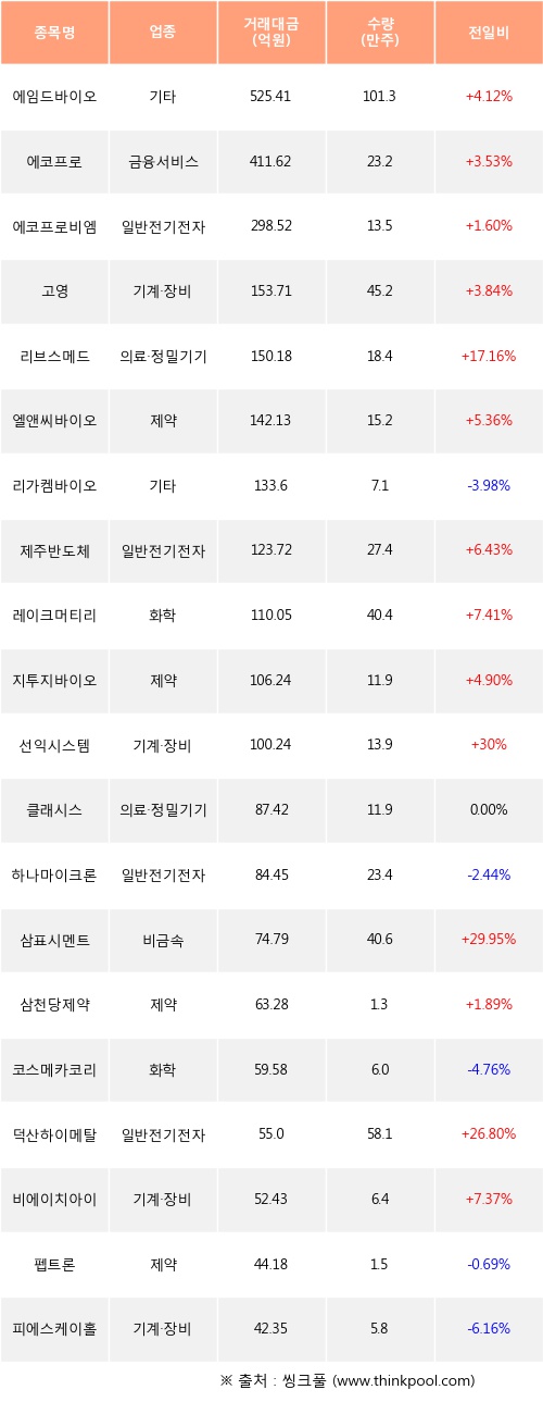 에임드바이오, 에코프로, 에코프로비엠 등은 전일 대비 주가가 상승했고, 리가켐바이오, 하나마이크론, 코스메카코리아 등은 주가가 하락했다.