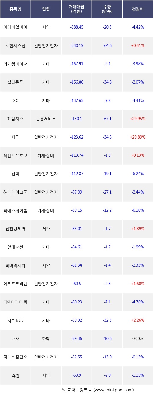 기관 투자자의 순매도 상위 20개 종목은 에이비엘바이오, 서진시스템, 리가켐바이오, 실리콘투, ISC, 하림지주, 파두, 레인보우로보틱스, 심텍, 하나마이크론등이다.
