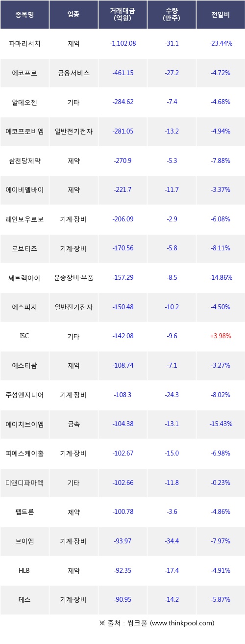 기관 투자자의 순매도 상위 20개 종목은 파마리서치, 에코프로, 알테오젠, 에코프로비엠, 삼천당제약, 에이비엘바이오, 레인보우로보틱스, 로보티즈, 쎄트렉아이, 에스피지등이다.