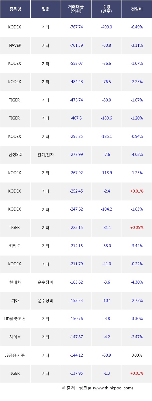 기관 투자자의 순매도 상위 20개 종목은 KODEX 코스닥150레버리지, NAVER, KODEX 200, KODEX 레버리지, TIGER 미국나스닥100, TIGER 미국S&P500, KODEX 200타겟위클리커버드콜, 삼성SDI, KODEX 미국S&P500, KODEX CD금리액티브(합성)등이다.
