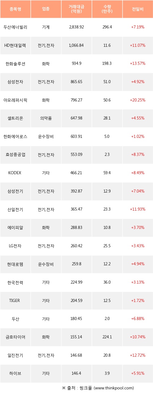 외국인 투자자의 순매수 상위 20개 종목은 두산에너빌리티, HD현대일렉트릭, 한화솔루션, 삼성전자, 아모레퍼시픽, 셀트리온, 한화에어로스페이스, 효성중공업, KODEX 레버리지, 삼성전기등이다.
