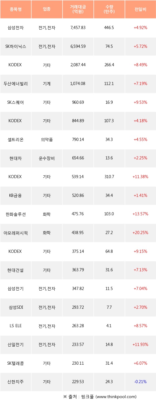 기관 투자자의 순매수 상위 20개 종목은 삼성전자, SK하이닉스, KODEX 레버리지, 두산에너빌리티, SK스퀘어, KODEX 200, 셀트리온, 현대차, KODEX 코스닥150레버리지, KB금융등이다.