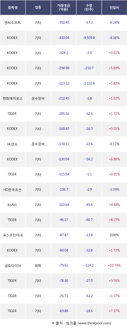 기관 투자자의 순매도 상위 20개 종목은 엔씨소프트, KODEX 200선물인버스2X, KODEX CD금리액티브(합성), KODEX 코스닥150, KODEX 2차전지산업레버리지, 한화에어로스페이스, TIGER 미국나스닥100, KODEX 머니마켓액티브, HL만도, KODEX 증권등이다.