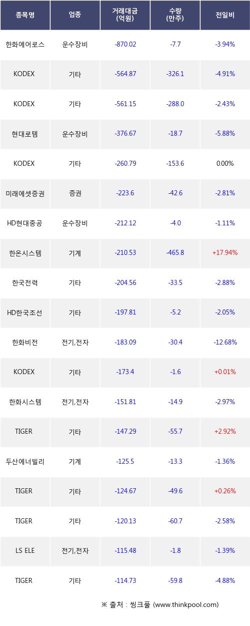 기관 투자자의 순매도 상위 20개 종목은 한화에어로스페이스, KODEX 코스닥150레버리지, KODEX 코스닥150, 현대로템, KODEX 200타겟위클리커버드콜, 미래에셋증권, HD현대중공업, 한온시스템, 한국전력, HD한국조선해양등이다.