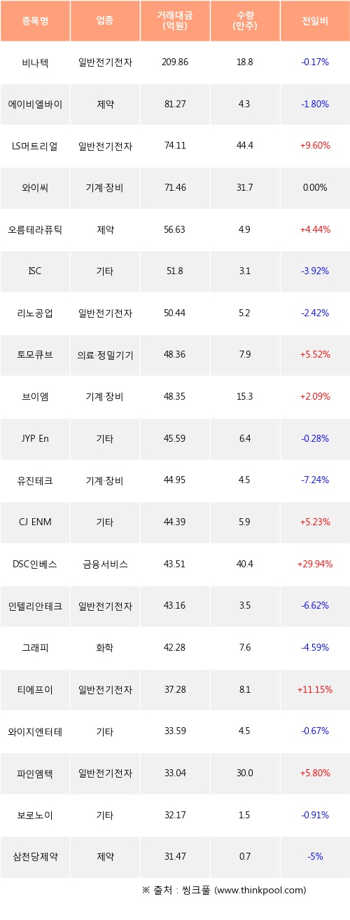 외국인 투자자의 순매수 상위 20개 종목은 비나텍, 에이비엘바이오, LS머트리얼즈, 와이씨, 오름테라퓨틱, ISC, 리노공업, 토모큐브, 브이엠, JYP Ent.등이다.