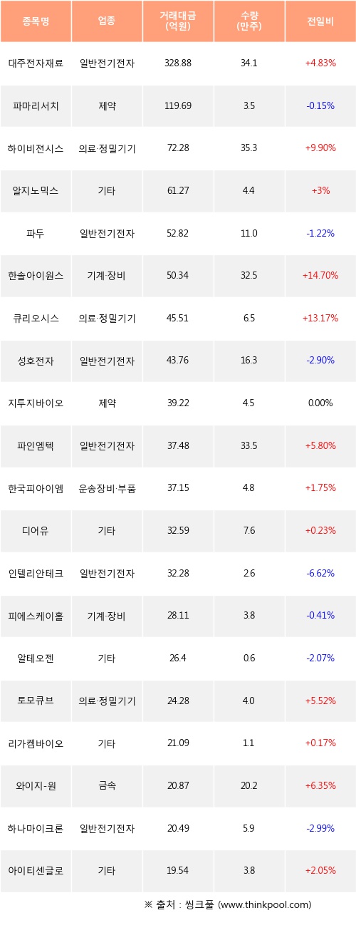 기관 투자자의 순매수 상위 20개 종목은 대주전자재료, 파마리서치, 하이비젼시스템, 알지노믹스, 파두, 한솔아이원스, 큐리오시스, 성호전자, 지투지바이오, 파인엠텍등이다.