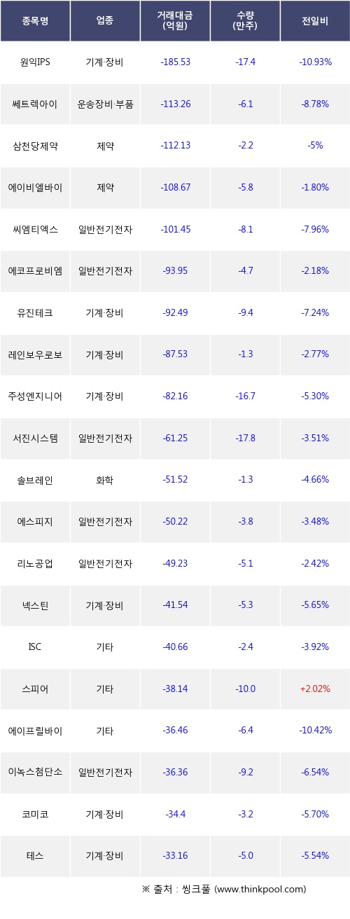 기관 투자자의 순매도 상위 20개 종목은 원익IPS, 쎄트렉아이, 삼천당제약, 에이비엘바이오, 씨엠티엑스, 에코프로비엠, 유진테크, 레인보우로보틱스, 주성엔지니어링, 서진시스템등이다.