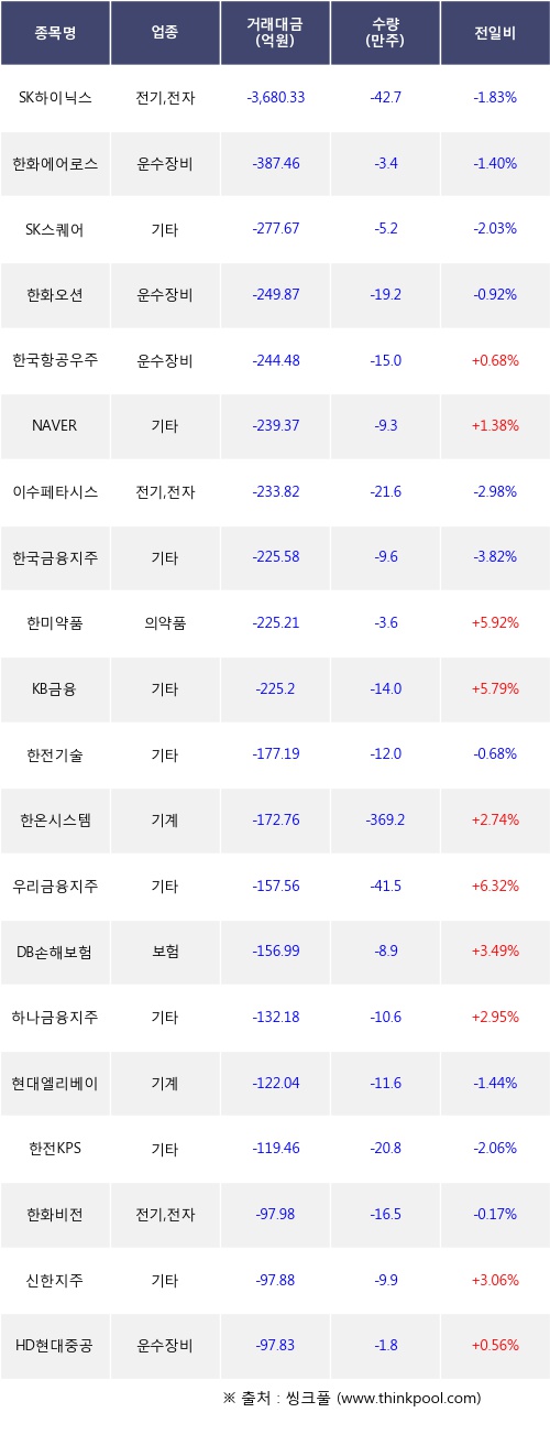 외국인 투자자의 순매도 상위 20개 종목은 SK하이닉스, 한화에어로스페이스, SK스퀘어, 한화오션, 한국항공우주, NAVER, 이수페타시스, 한국금융지주, 한미약품, KB금융등이다.