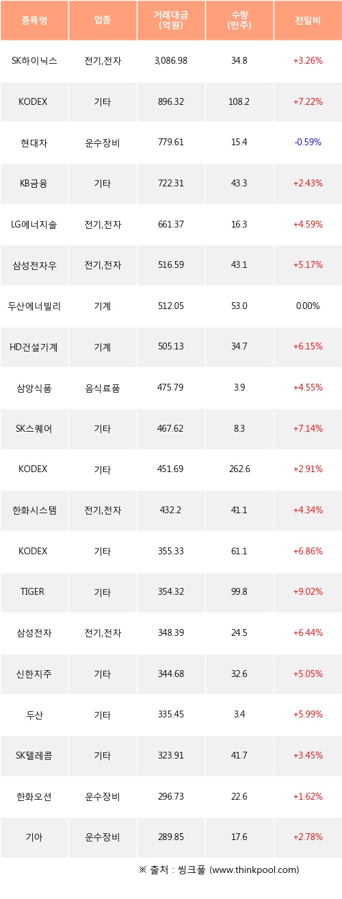 기관 투자자의 순매수 상위 20개 종목은 SK하이닉스, KODEX 레버리지, 현대차, KB금융, LG에너지솔루션, 삼성전자우, 두산에너빌리티, HD건설기계, 삼양식품, SK스퀘어등이다.