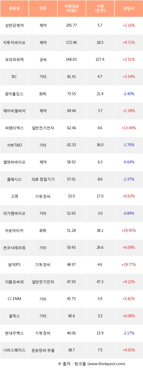 외국인 투자자의 순매수 상위 20개 종목은 삼천당제약, 지투지바이오, 보성파워텍, ISC, 원익홀딩스, 에이비엘바이오, 씨엠티엑스, 서부T&D, 엘앤씨바이오, 클래시스등이다.