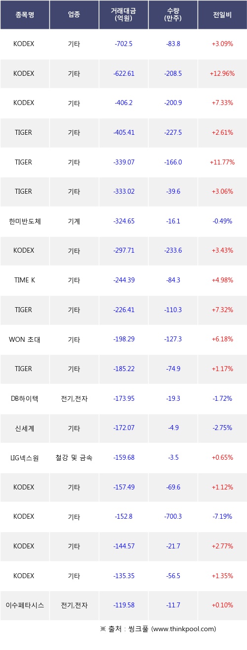 기관 투자자의 순매도 상위 20개 종목은 KODEX 200, KODEX 증권, KODEX 코스닥150, TIGER 배당커버드콜액티브, TIGER 증권, TIGER 200, 한미반도체, KODEX 주주환원고배당주, TIME Korea플러스배당액티브, TIGER 코스닥150등이다.