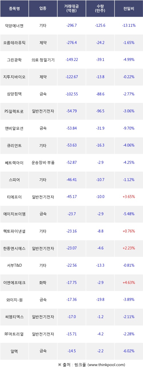기관 투자자의 순매도 상위 20개 종목은 덕양에너젠, 오름테라퓨틱, 그린광학, 지투지바이오, 삼양컴텍, PS일렉트로닉스, 엔비알모션, 큐리언트, 쎄트렉아이, 스피어등이다.
