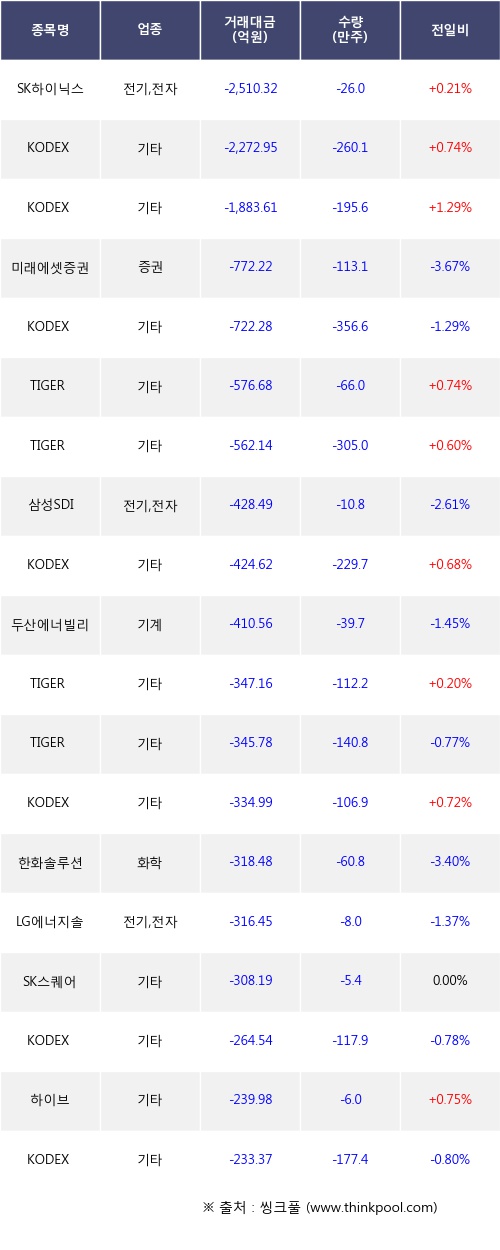 기관 투자자의 순매도 상위 20개 종목은 SK하이닉스, KODEX 200, KODEX 레버리지, 미래에셋증권, KODEX 코스닥150, TIGER 200, TIGER 배당커버드콜액티브, 삼성SDI, KODEX 200타겟위클리커버드콜, 두산에너빌리티등이다.