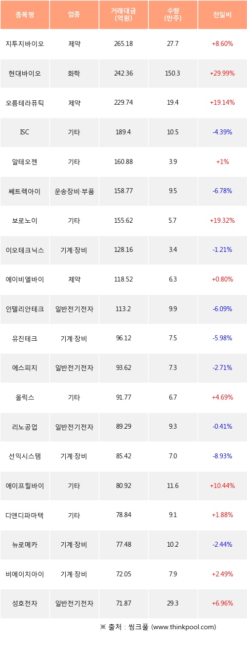 외국인 투자자의 순매수 상위 20개 종목은 지투지바이오, 현대바이오, 오름테라퓨틱, ISC, 알테오젠, 쎄트렉아이, 보로노이, 이오테크닉스, 에이비엘바이오, 인텔리안테크등이다.